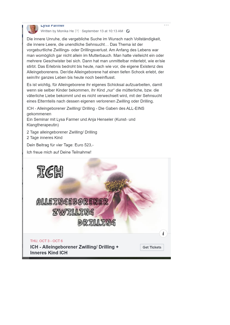 Dieses brisante Thema ist für Männer als auch für Frauen – auf einer „Geschwister-Ebene“, sowie auf die „gezeugt zu haben“ (Vaterschaft) und „getragen zu haben“ (Mutterschaft) Ebenen sehr wichtig; denn es fehlt was und wer im Leben… Der „leere“ Platz kann erkannt werden und durch Lebensfreude, sowie die eigene Lebendigkeit und Excellenz aufgefüllt werden.
